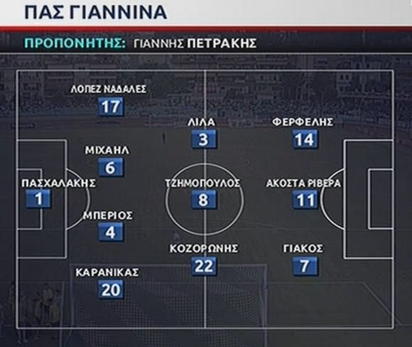 ΠΑΣ ΓΙΑΝΝΙΝΑ (Πετράκης): Πασχαλάκης, Τζημόπουλος, Μπέριος, Μιχαήλ, Καρανίκας, Λίλα, Ναδάλες, Κοζορώνης, Ακόστα (90’+2′ Σκόνδρας), Γιάκος (80′ Δώνης), Φερφελής (77′ Κόντε).