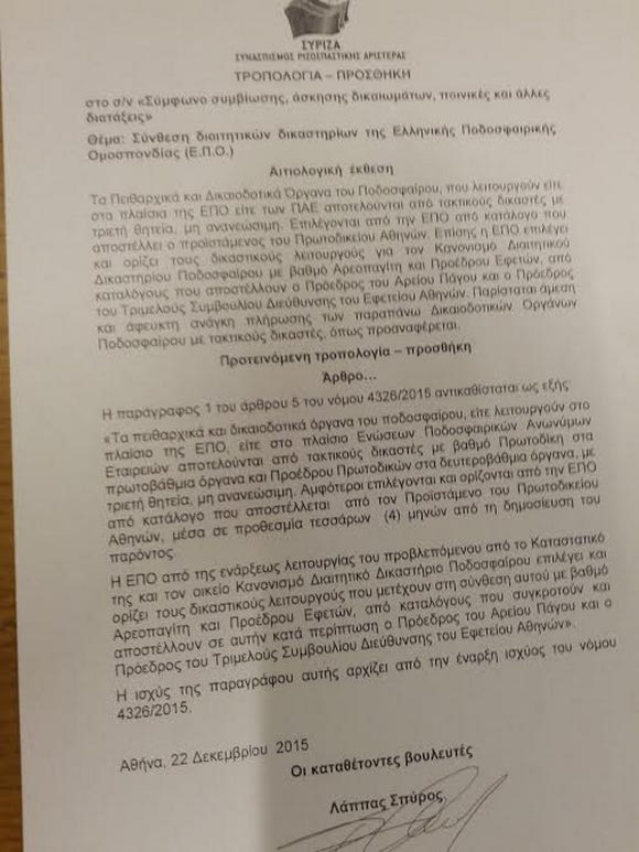 Όπως αναφέρεται στην αιτιολογική έκθεση “τα Πειθαρχικά και Δικαιοδοτικά Όργανα του Ποδοσφαίρου, που λειτουργούν είτε στα πλαίσια της ΕΠΟ είτε των ΠΑΕ αποτελούνται από τακτικούς δικαστές με τριετή θητεία, μη ανανεώσιμη. Επιλέγονται από την ΕΠΟ από κατάλογο που αποστέλλει ο προϊστάμενος του Πρωτοδικείου Αθηνών. Επίσης η ΕΠΟ επιλέγει και ορίζει τους δικαστικούς λειτουργούς για τον Κανονισμό Διαιτητικού Δικαστηρίου Ποδοσφαίρου με βαθμό Αρεοπαγίτη και Προέδρου Εφετών, από καταλόγους που αποστέλλουν ο Πρόεδρος του Αρείου Πάγου και ο Πρόεδρος του Τριμελούς Συμβουλίου Διεύθυνσης του Εφετείου Αθηνών. Παρίσταται άμεση και άφευκτη ανάγκη πλήρωσης των παραπάνω Δικαιοδοτικών Οργάνων Ποδοσφαίρου με τακτικούς δικαστές, όπως προαναφέρεται”.