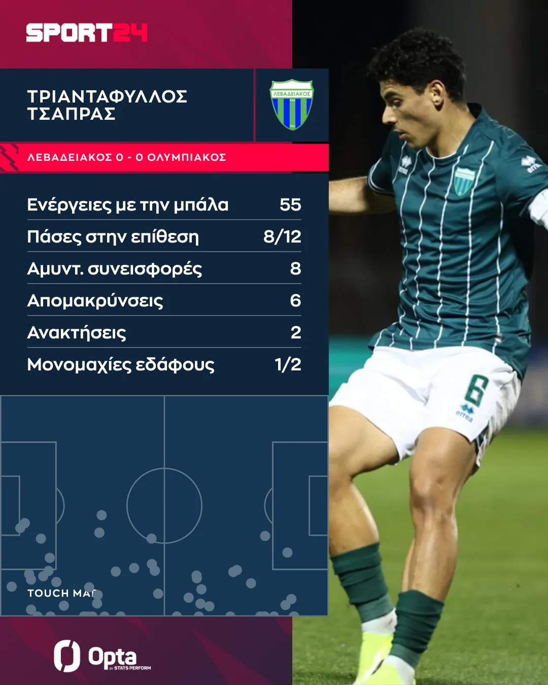 Ο Τριαντάφυλλος Τσάπρας πραγματοποίησε ακόμα ένα εξαιρετικό παιχνίδι με τη φανέλα του Λεβαδειακού, αυτή τη φορά κρατώντας στο μηδέν τον Ολυμπιακό (0-0) σε ένα παιχνίδι που η ομάδα του αγωνιζόταν με δέκα παίκτες για ένα ημίχρονο. Το SPORT24 σας παρουσιάζει τα πεπραγμένα του 24χρονου δεξιού μπακ κόντρα στους ερυθρόλευκους.