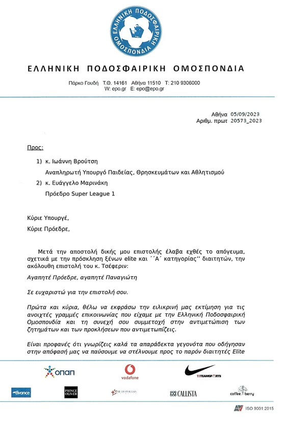 Αναλυτικά η επιστολή του Τσέφεριν: “Μετά την αποστολή δικής μου επιστολής έλαβα εχθές το απόγευμα, σχετικά με την πρόσκληση ξένων elite και Α κατηγορίας διαιτητών την ακόλουθη επιστολή του κ. Τσέφεριν.