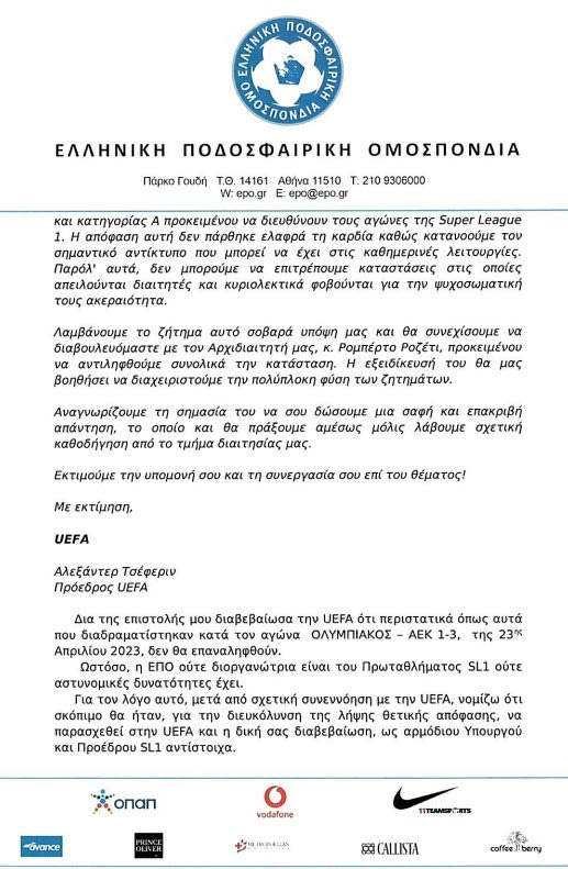 Στη συνέχεια της επιστολή που κοινοποίησε ο κ. Μπαλτάκος αναφέρει: “Δια της επιστολής μου διαβεβαίωσα την UEFA ότι περιστατικά, όπως αυτά που διαδραματίστηκαν κατά τον αγώνα ΟΛΥΜΠΙΑΚΟΣ – ΑΕΚ 1-3 της 23ης Απριλίου 2023, δεν θα επαναληφθούν.