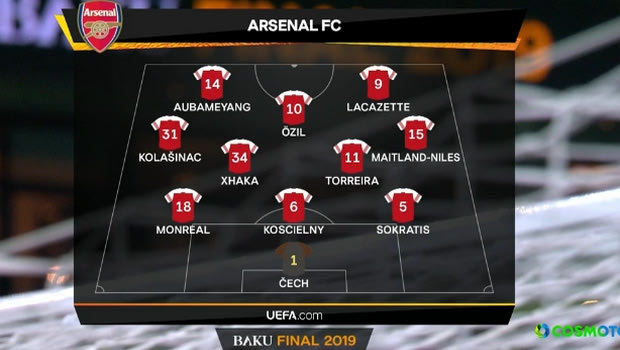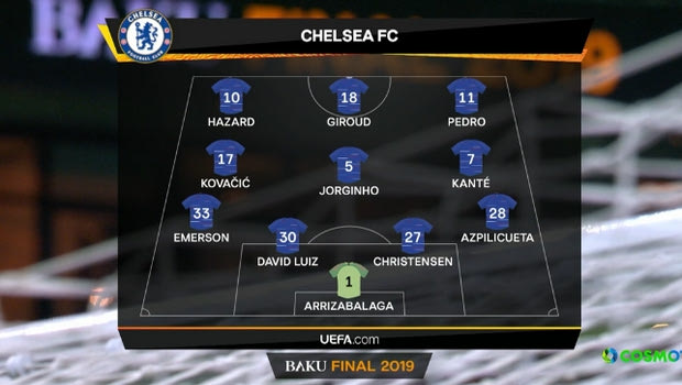 Γήπεδο: Baku Olympic Stadium Διαιτητής: Gianluca Rocchi (Ιταλία) Βοηθοί: Filippo Meli, Lorenzo Manganelli (Ιταλία) 4ος: Daniele Orsato (Ιταλία) ΤΣΕΛΣΙ (Μαουρίτσιο Σάρι): Κέπα, Αθπιλικουέτα, Κρίστενσεν, Νταβίντ Λουίζ, Έμερσον Παλμιέρι, Καντέ, Ζορζίνιο, Κόβατσιτς (76′ Μπάρκλεϊ), Πέδρο (71′ Ουίλιαν), Ζιρού, Αζάρ (89′ Τζαπακόστα). ΑΡΣΕΝΑΛ (Ουνάι Έμερι): Τσεχ, Παπασταθόπουλος, Κοσιελνί, Μονρεάλ (66′ Γκεντουζί), Μέιτλαντ-Νάιλς, Τορέιρα (66′ Ιγουόμπι), Τζάκα, Κολάσινατς, Εζίλ (78′ Γουίλοκ), Λακαζέτ, Ομπαμεγιάνγκ. Γκολ: 49’Ζιρού,60’Πέδρο,65′ πεν., 72′ Αζάρ – 69′ Ιγουόμπι Κίτρινες: 68′ Κρίστενσεν – 57′ Πέδρο |