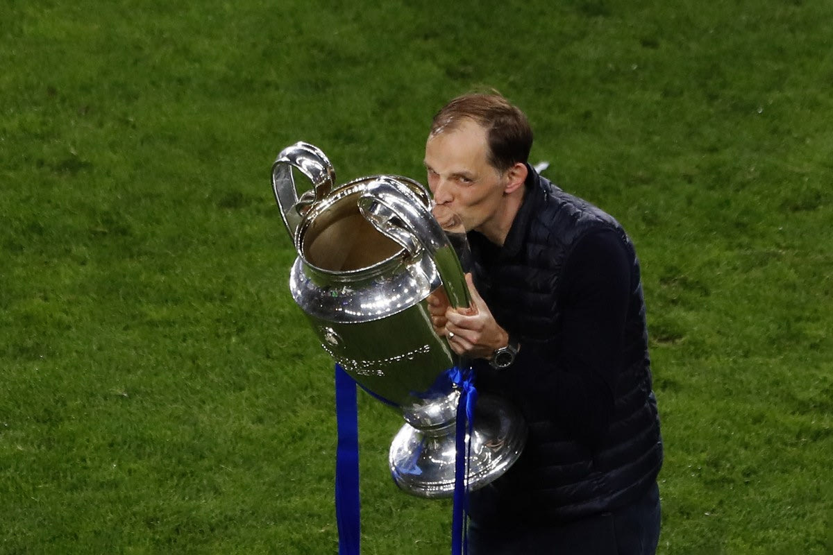 O Τόμας Τούχελ πανηγυρίζει τη νίκη της Τσέλσι επί της Μάντσεστερ Σίτι στον τελικό του Champions League φιλώντας το τρόπαιο (29 Μαΐου 2021)