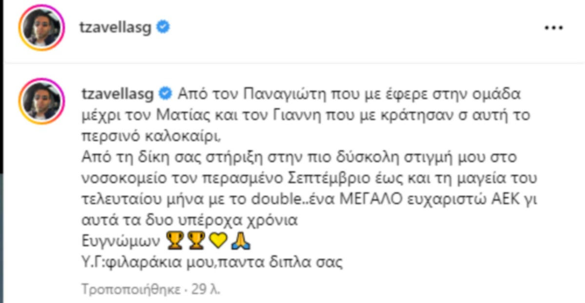 Ο Γιώργος Τζαβέλλας με ανάρτησή του στο Instagram ευχαρίστησε την ΑΕΚ για αυτά τα δύο χρόνια που βρίσκεται στην ομάδα, αλλά και τη μαγεία των τελευταίων μηνών.