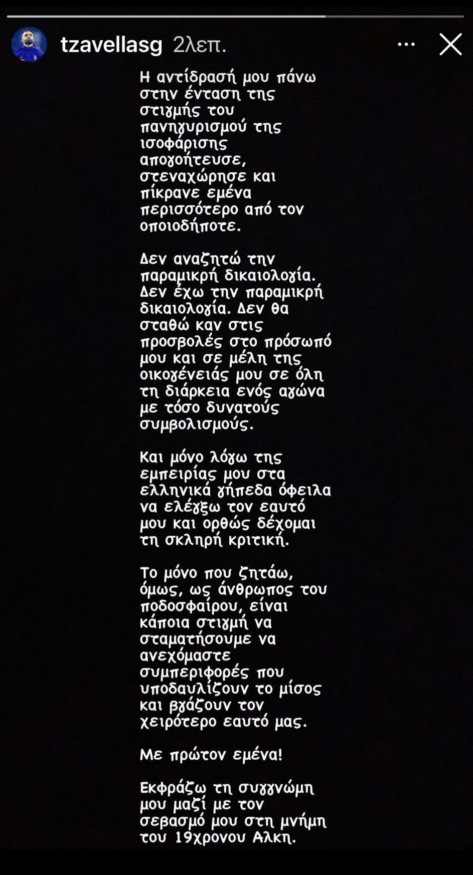 Εκφράζω τη συγγνώμη μου μαζί με τον σεβασμό μου στη μνήμη του 19χρονου Άλκη”.