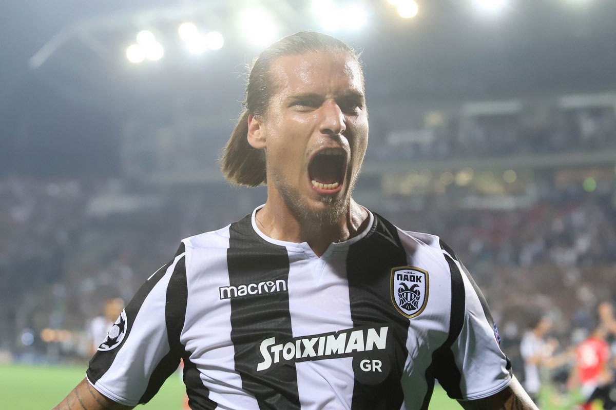 Ο Πρίγιοβιτς πανηγυρίζει με τη φανέλα του ΠΑΟΚ MotionTeam
