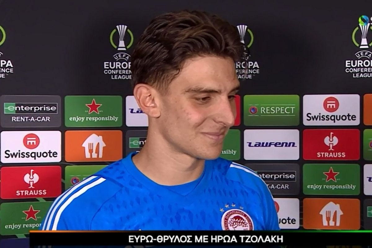 Ο μεγάλος πρωταγωνιστής της πρόκρισης του Ολυμπιακού, Κωνσταντίνος Τζολάκης, στις δηλώσεις του μετά το τέλος του αγώνα τόνισε πως όλοι έχουν στο μυαλό τους το Conference League, μίλησε για τις αποκρούσεις του στα πέναλτι ενώ αναφέρθηκε και στο φυλακτό που του έδωσε ο πατέρας του πριν την έναρξη της διαδικασίας.