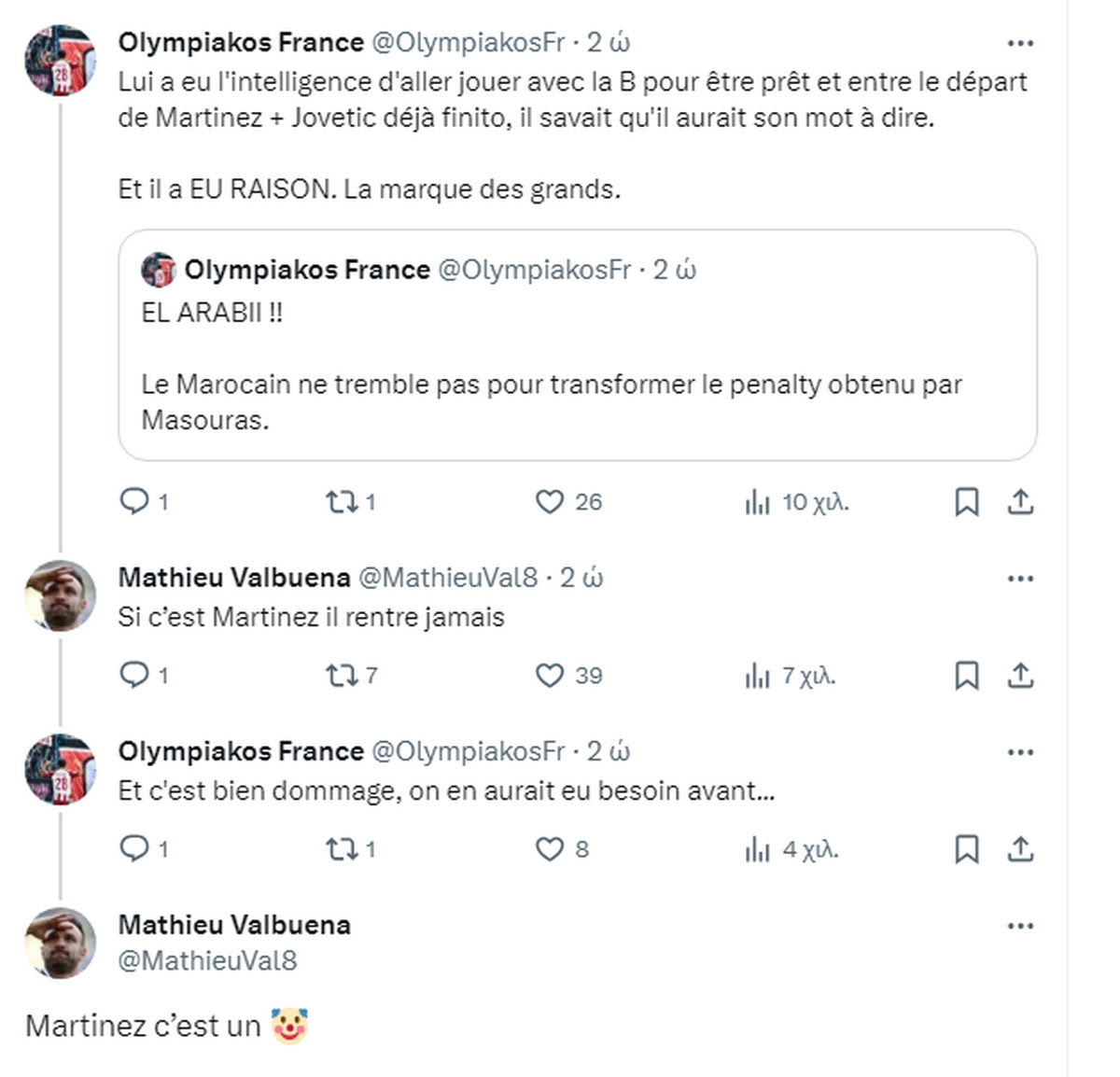 Ο Ματιέ Βαλμπουενά σχολίασε στο Twitter κάτω από ανάρτηση για τη νίκη του Ολυμπιακού με γκολ του Αραμπί, αναφέροντας πως ο Ντιέγκο Μαρτίνεθ είναι κλόουν.