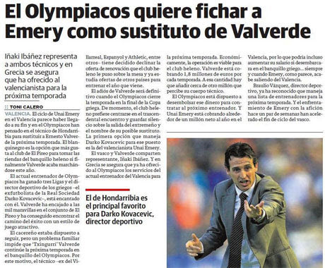 Δημοσίευμα της “Las Provincias” με τίτλο “Ο Ολυμπιακός θέλει τον Έμερι ως αντικαταστάτη του Βαλβέρδε” (12-4-2012)
