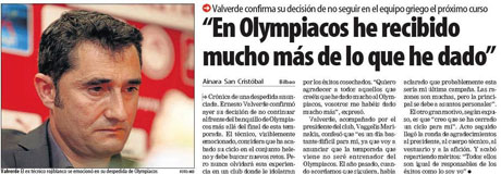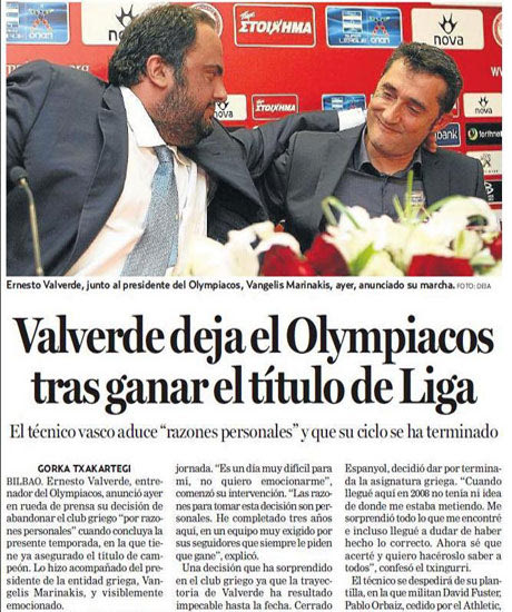 «Ο Βαλβέρδε αφήνει τον Ολυμπιακό μετά την κατάκτηση του πρωταθλήματος». Deia, 20-4-2012
