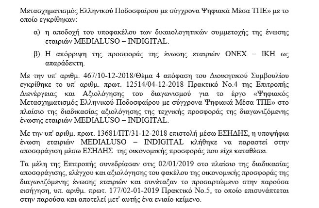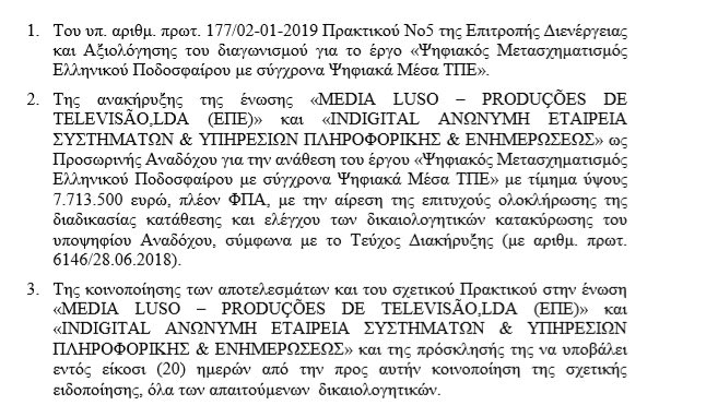 H ένωση εταιρειών MEDIALUSO - INDIGITAL κέρδισε τον διαγωνισμό για την υλοποίηση του VAR, καθώς ανακηρύχθηκε προσωρινός ανάδοχος, μέχρι να περάσει από νομικό έλεγχο και να υπογραφεί η σύμβαση.