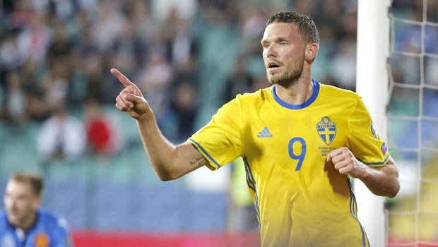 Sweden's Marcus Berg celebrates his goal against Bulgaria, during the World Cup Group A qualifying soccer match between Bulgaria and Sweden at Vassil Levski Stadium in Sofia, Bulgaria, Thursday Aug. 31, 2017. (AP Photo/STR)
