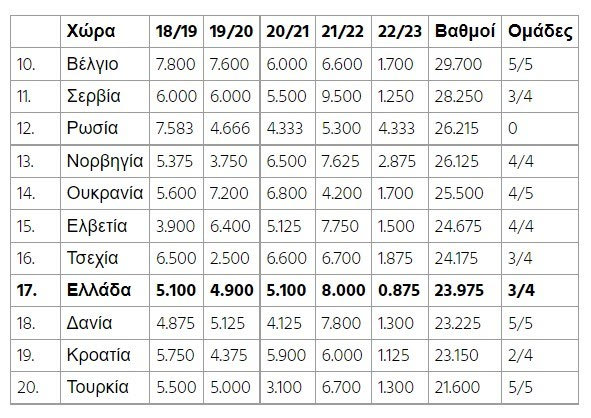 Ενώ τόσο η Δανία όσο και η Κροατία που ακολουθούν μείωσαν την απόσταση από την Ελλάδα και μάλιστα οι Δανοί συνεχίζουν με πέντε ομάδες στις Ευρωπαϊκές διοργανώσεις.
