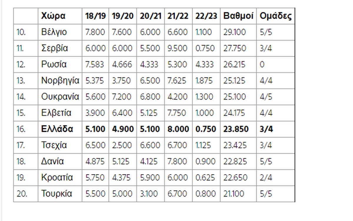 Η ΚΑΤΑΤΑΞΗ ΤΗΣ UEFA ΑΠΟ ΤΗ 10Η ΘΕΣΗ ΕΩΣ ΤΗΝ 20Η: