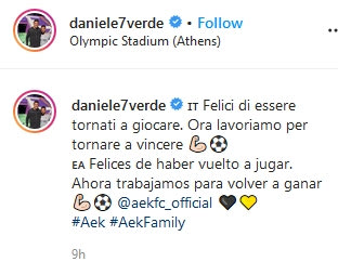 Πάντως, με την ανάρτησή του στο Instagram έδειξε διάθεση να αφήσει πίσω του ό,τι συνέβη. “Χαρούμενος που επιστρέψαμε στην δράση. Τώρα πρέπει να δουλέψουμε για να επιστρέψουμε και στις νίκες. ΑΕΚ, οικογένεια“, ανέφερε ο Βέρντε.