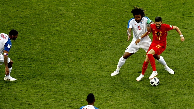 Belgium's Yannick Carrasco, right, vies for the ball with Panama's Roman Torres during the group G match between Belgium and Panama at the 2018 soccer World Cup in the Fisht Stadium in Sochi, Russia, Monday, June 18, 2018. (AP Photo/Victor R. Caivano)