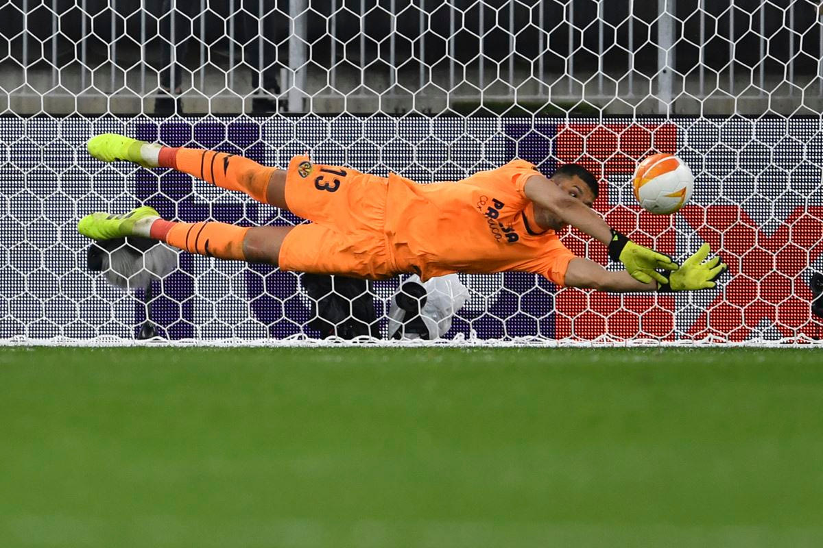 Villareal's goalkeeper Geronimo Rulli saves the penalty shot by Manchester United's goalkeeper David de Gea during the Europa League final soccer match between Manchester United and Villarreal in Gdansk, Poland, Wednesday May 26, 2021. (Adam Warzawa, Pool via AP)