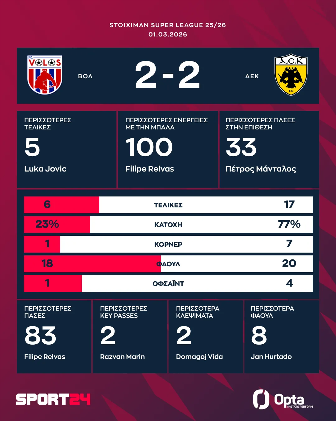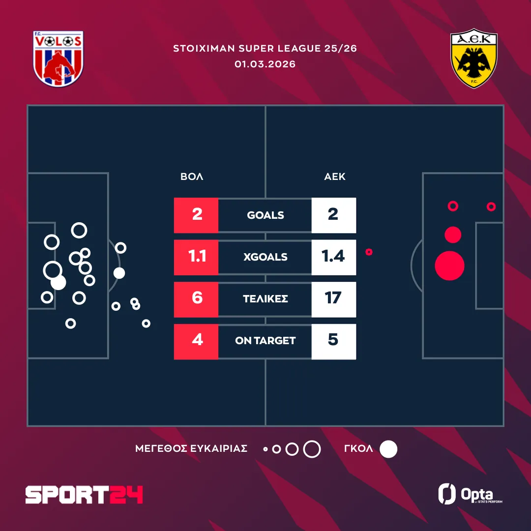 Η ΑΕΚ λογάριαζε χωρίς τον ξενοδόχο. Η Ένωση σκόνταψε κόντρα στον Βόλο, σώζοντας τον βαθμό στο τέλος. Το γκολ του Κόμπα και το πέναλτι του Ουρτάδο πλήγωσαν την Ένωση που έχασε τη μοναξιά της κορυφής. Οι κιτρινόμαυροι ισοφάρισαν αρχικά με τον Βάργκα και στην τελευταία φάση με τον Ρέλβας. Η ομάδα του Μάρκο Νίκολιτς, που αποβλήθηκε από τον Τσιμεντερίδη στο ημίχρονο είχε δύο δοκάρια και παράπονα για τη διαιτησία του αγώνα.
