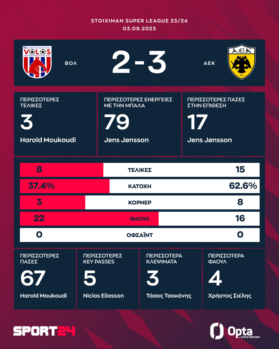 Η ΑΕΚ έπαιζε με δέκα παίκτες από το 24' κόντρα στον Βόλο, ούσα πίσω στο σκορ με το γκολ του Ντέλετιτς, όμως βρήκε τα ψυχικά αποθέματα για την ανατροπή πετυχαίνοντας δύο γκολ με τον Γιόνσον και τον Τσούμπερ. Ο Ντέλετιτς ισοφάρισε στο 72', όμως ο Άμραμπατ με εύστοχο χτύπημα πέναλτι στο 90+3' χάρισε το τρίποντο στην Ένωση με περιπετειώδη τρόπο.
