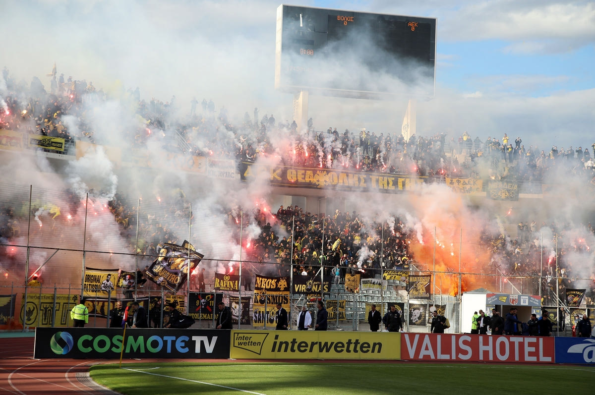 Οι φίλοι της ΑΕΚ έδωσαν δυναμικό παρών κόντρα στον Βόλο στο Πανθεσσαλικό για να σπρώξουν την ομάδα τους σε μια ακόμα νίκη για την κατάκτηση του τίτλου.
