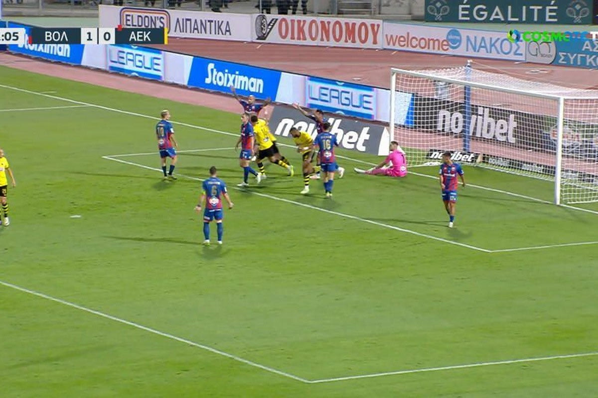 Δύο εκτελέσεις φάουλ, μία που κατέληξε σε κεφαλιά του Γενς Γιόνσον και μία απευθείας από τον Στίβεν Τσούμπερ έφεραν την ΑΕΚ μπροστά στο σκορ με 2-1 στον Βόλο, παρότι αγωνιζόταν με 10 παίκτες.