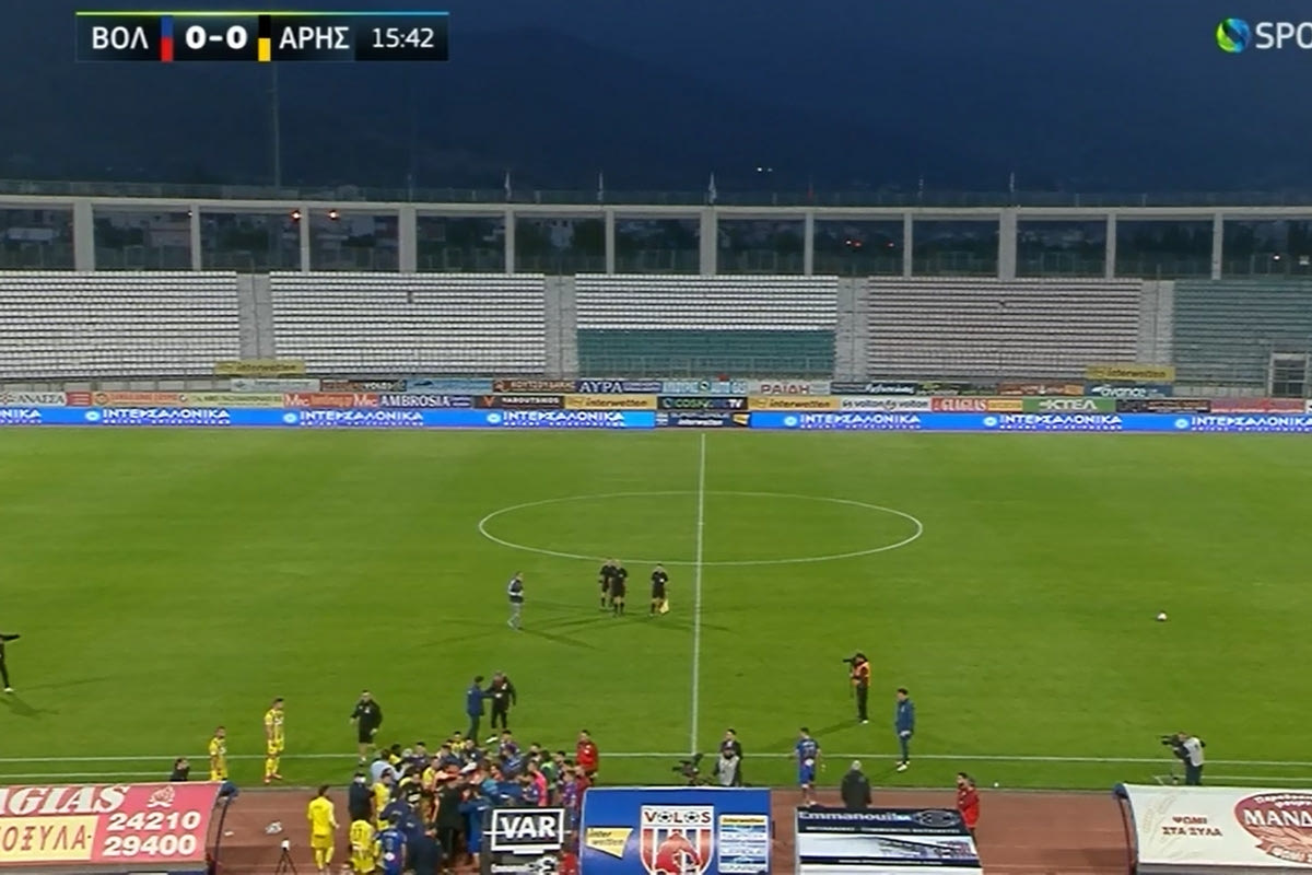 Η αναμέτρηση ανάμεσα στον Βόλο και τον Άρη για την 9η αγωνιστική της Super League Interwetten είχε διακοπή εξαιτίας έντασης στην κερκίδα. Ωστόσο, η κατάσταση δεν ήταν καλύτερη και μέσα στον αγωνιστικό χώρο.