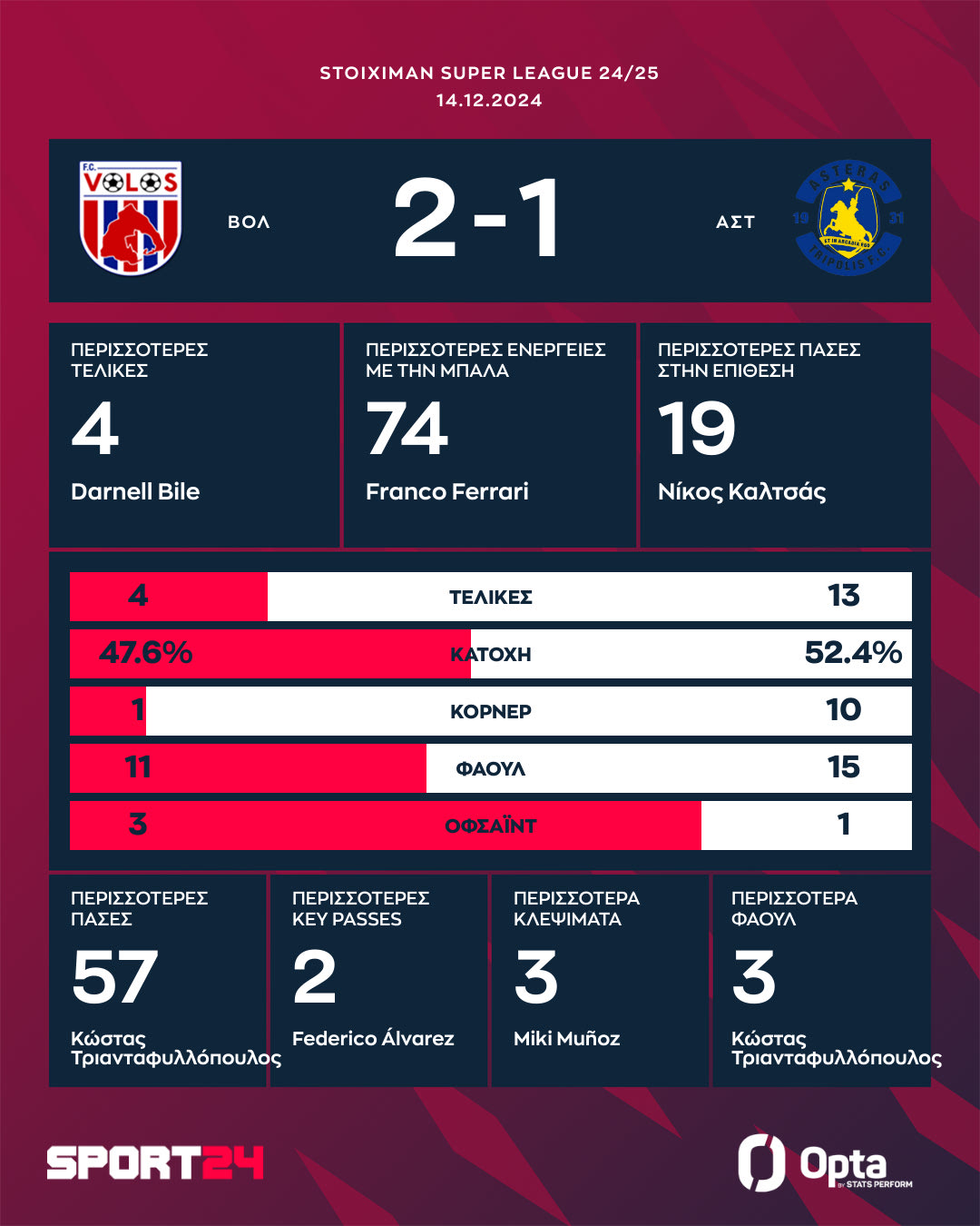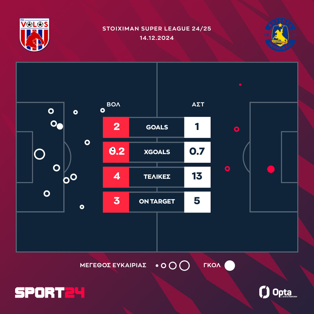 Ο Βόλος κόντρα στη ροή του αγώνα πέτυχε δύο γκολ σε δύο τελικές κόντρα στον Αστέρα AKTOR. Οι Αρκάδες πίεσαν για να πάρουν κάτι, αλλά απλά μείωσαν στο 87' με τον Όκο.