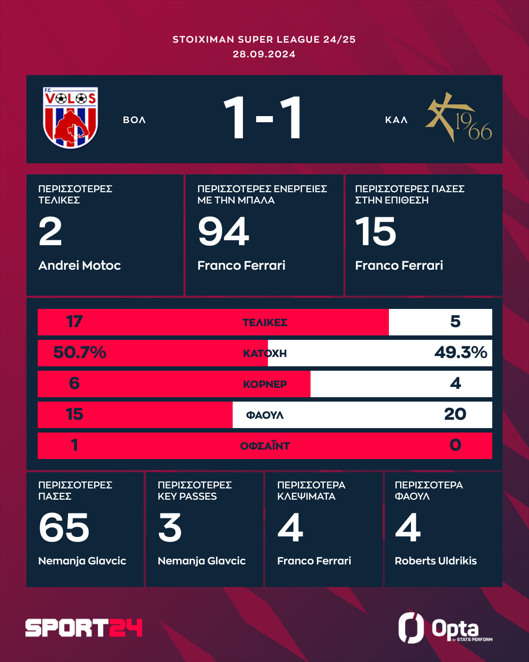 Η Athens Kallithea έφτασε τις πέντε ισοπαλίες σε έξι παιχνίδια στη Stoiximan Super League χάρη στο 1-1 με τον Βόλο στο Πανθεσσαλικό. Η ομάδα του Μάσιμο Ντονάτι ήταν αυτή που προηγήθηκε στο 23′ με τον Τζιάνι και οι γηπεδούχοι (με τον Σάββα Πουρσαϊτίδη να κάνει ντεμπούτο στον πάγκο) ισοφάρισαν με τον Μεντιέτα στο 37′.