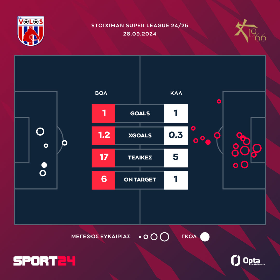 Βόλος και Athens Kallithea πέτυχαν από ένα γκολ στο πρώτο μέρος με τον Τζιάνι στο 23' και τον Μεντιέτα στο 37' με τον Μπερναμπέ να κρατά όρθιους τους φιλοξενούμενους με εντυπωσιακές επεμβάσεις στο δεύτερο μέρος.
