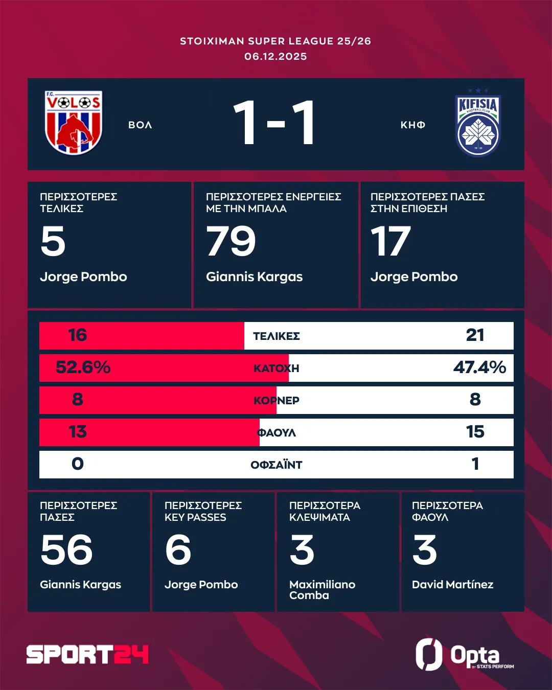 Βόλος και Κηφισιά περιορίστηκαν στον έναν βαθμό στο Πανθεσσαλικό, έπειτα από ένα πρώτο ημίχρονο με καλό ρυθμό και αμφότερες τις ομάδες να βρίσκουν δίχτυα, στο πλαίσιο της 13ης αγωνιστικής της Stoiximan Super League.