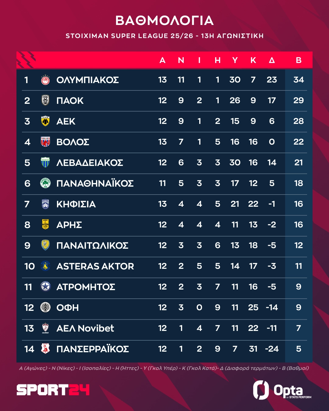 Το πρόγραμμα και τα αποτελέσματα της 13ης αγωνιστικής