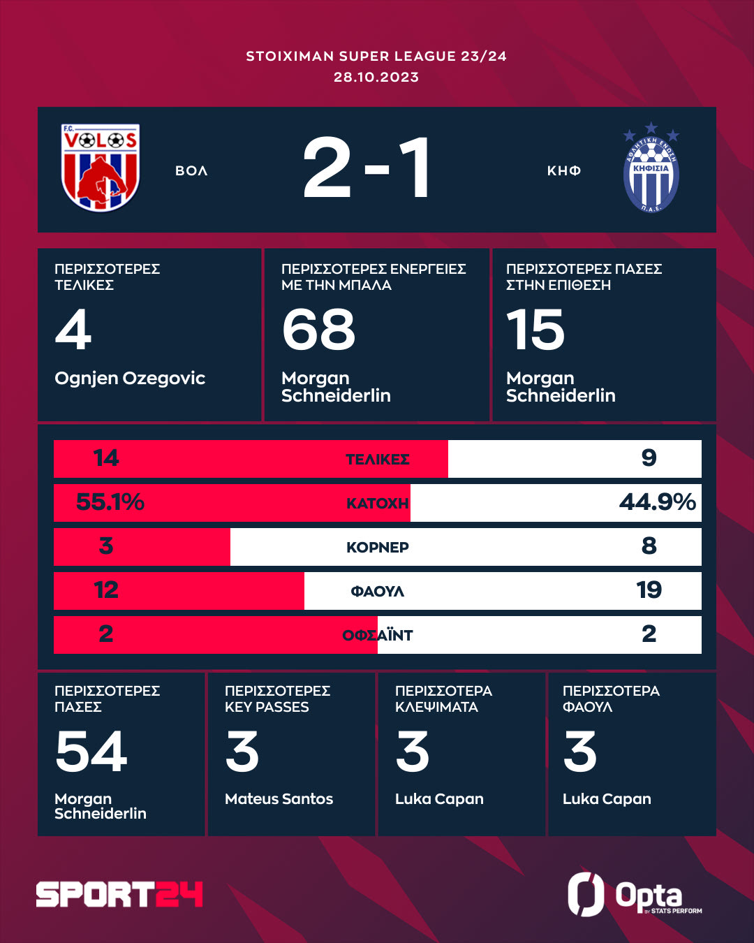 Ο Οζέγκοβιτς μείωσε το σκορ στο 82′, με την Κηφισιά να τελειώνει το ματς με εννέα παίκτες εξαιτίας της αποβολής των Τσάπαν (70′) και Σάντος (84′). Κάπως έτσι στη βαθμολογία, ο Βόλος έφτασε τους πέντε βαθμούς, με την Κηφισιά να μένει στους επτά.