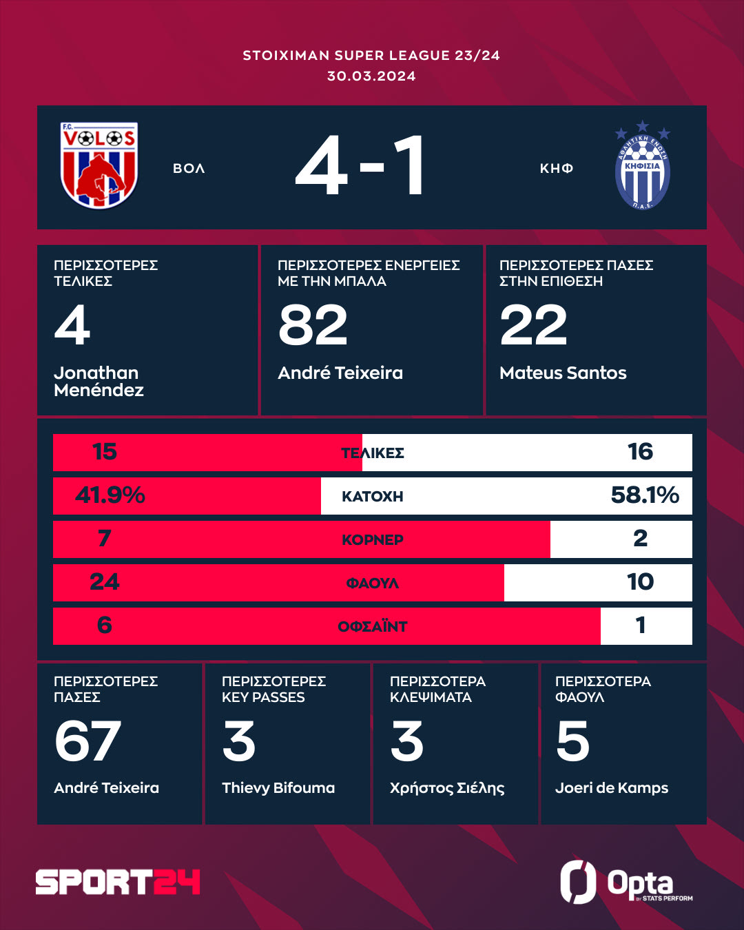 Οι κορυφαίες επιδόσεις και τα στατιστικά στο Βόλος - Κηφισιά SPORT24/OPTA