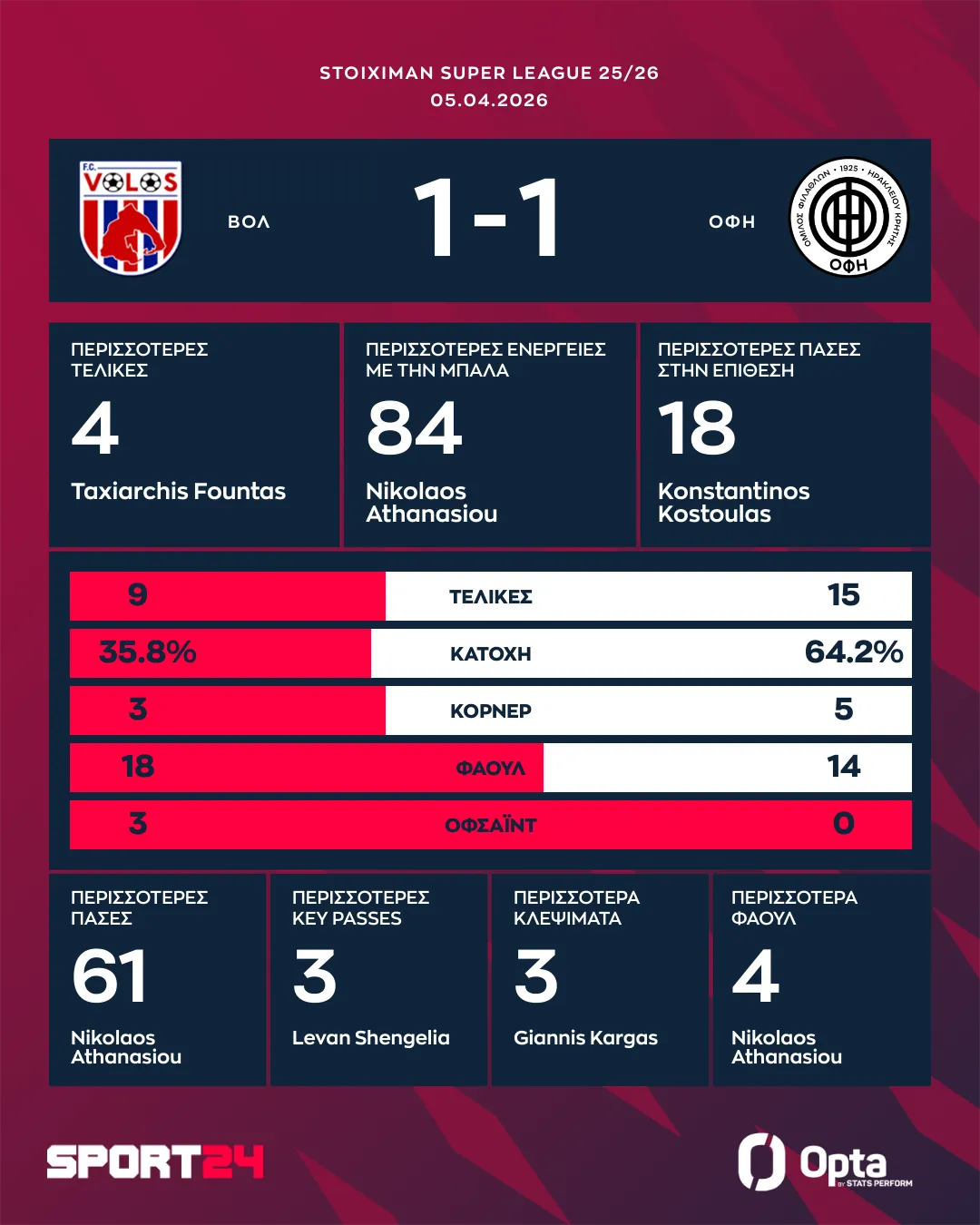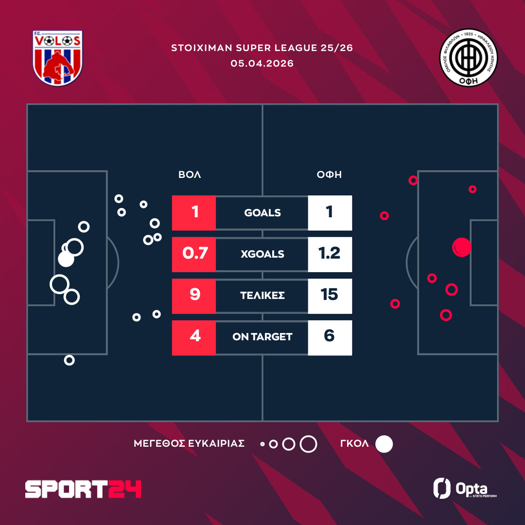 Ο Λάζαρος Λάμπρου άνοιξε το σκορ με κεφαλιά στο 69ο λεπτό της αναμέτρησης. Στο 75′ ο Φούντας απάντησε, στέλνοντας με το κεφάλι την μπάλα στα δίχτυα. Στη βαθμολογία των playoffs 5-8, οι ισορροπίες δεν άλλαξαν. Ο Βόλος και ο ΟΦΗ είναι στους 17 πόντους στο -5 από τον Λεβαδειακό.