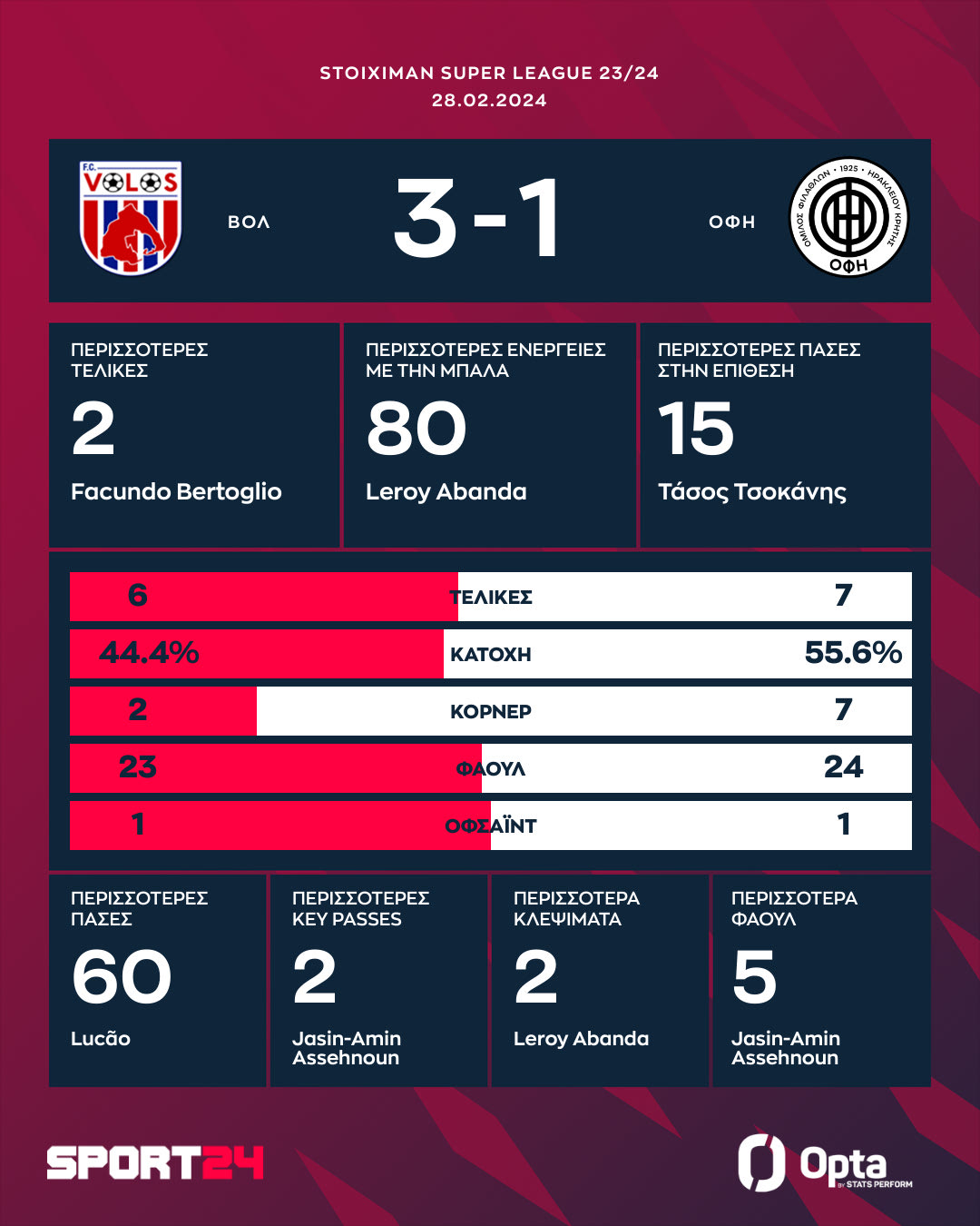 Οι κορυφαίες επιδόσεις και τα στατιστικά στο Βόλος - ΟΦΗ SPORT24/OPTA