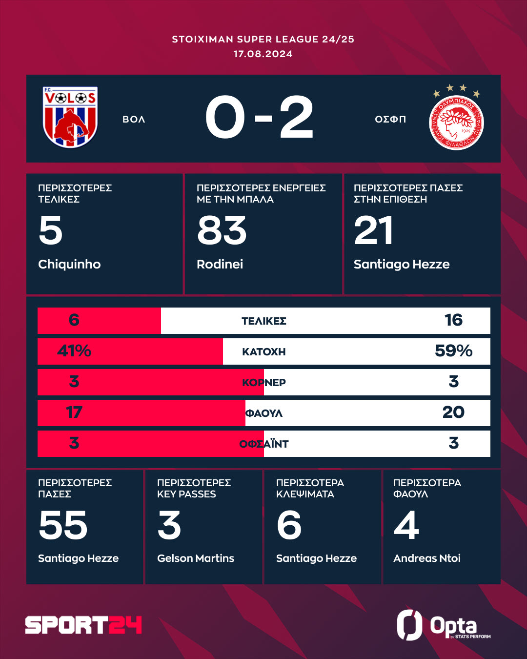 O Oλυμπιακός ξεκίνησε με νίκη στη Stoiximan Super League, επικρατώντας 2-0 του Βόλου στο Πανθεσσαλικό Στάδιο. Γκολ από Ροντινέι (13'), αυτογκόλ από Κορρεά μετά το σουτ του Μασούρα (73'), με τον Μαρτίνς να εντυπωσιάζει. Με δέκα παίκτες οι Θεσσαλοί από το 32'.