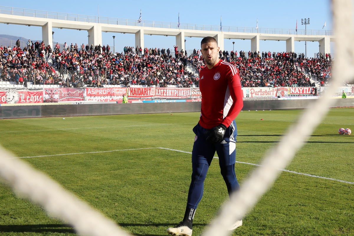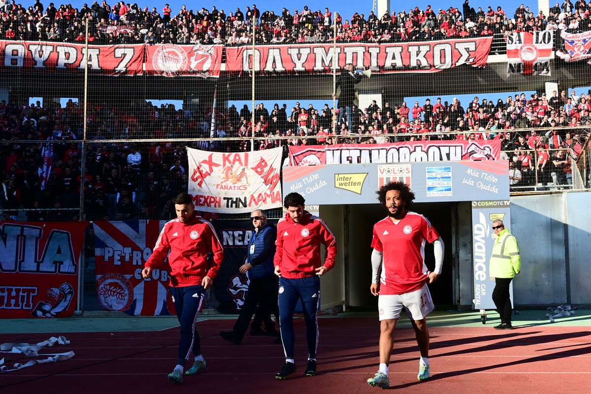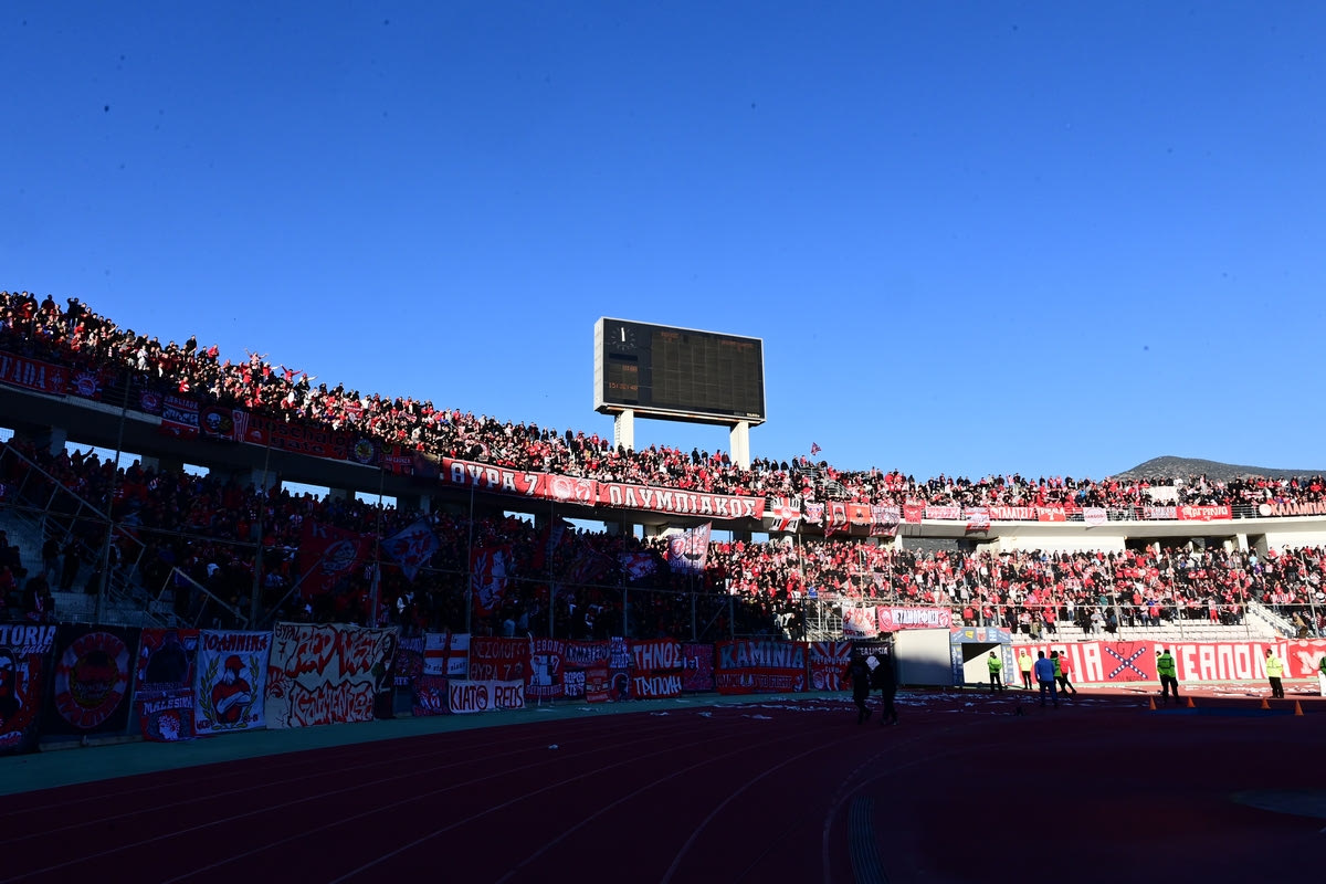 Οι οπαδοί του Ολυμπιακού κατέκλυσαν το Πανθεσσαλικό Στάδιο για την αναμέτρηση κόντρα στον Βόλο, με την έδρα των Θεσσαλών να βάφεται κόκκινη.