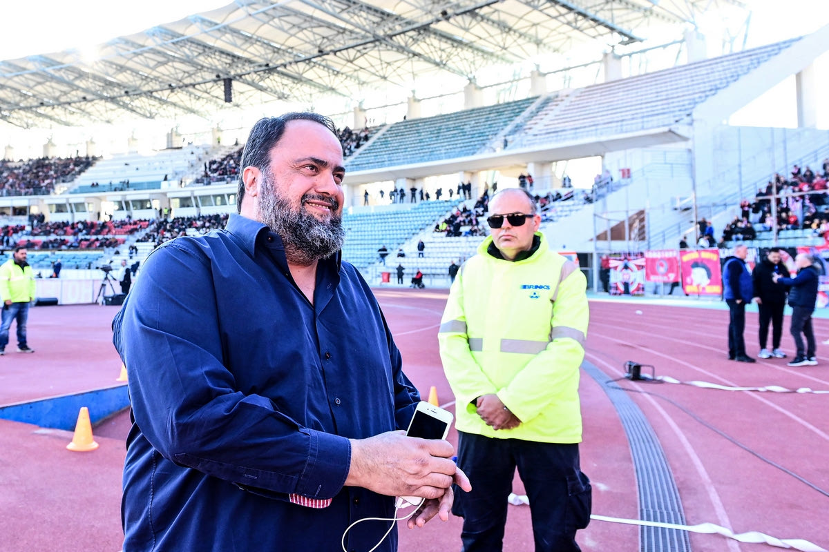 Ο πρόεδρος και ιδιοκτήτης του Ολυμπιακού, Βαγγέλης Μαρινάκης, βρέθηκε στο Πανθεσσαλικό Στάδιο για την αναμέτρηση των ερυθρόλευκων κόντρα στον Βόλο.