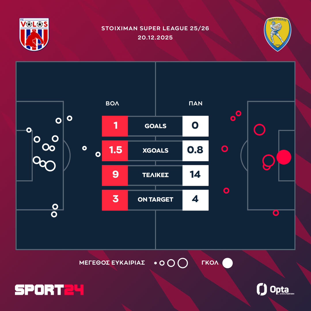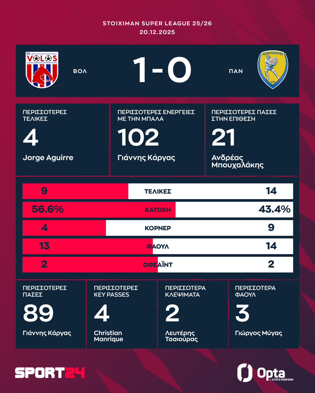 Ο Βόλος επέστρεψε στις νίκες στη Stoiximan Super League καθώς επικράτησε 1-0 του Παναιτωλικού και έκλεισε με τον καλύτερο τρόπο το 2025. Το χρυσό γκολ της ομάδας του Χουάν Φεράντο πέτυχε ο Μαρτίνεθ στο 660ο λεπτό. Ο Πίντσι με ωραία κάθετη βρήκε τον Χάμουλιτς, αυτός έκανε το παράλληλο γύρισμα, από τις κόντρες επωφελήθηκε ο σκόρερ των Θεσσαλών που δεν είχε πρόβλημα να σκοράρει από κοντά.