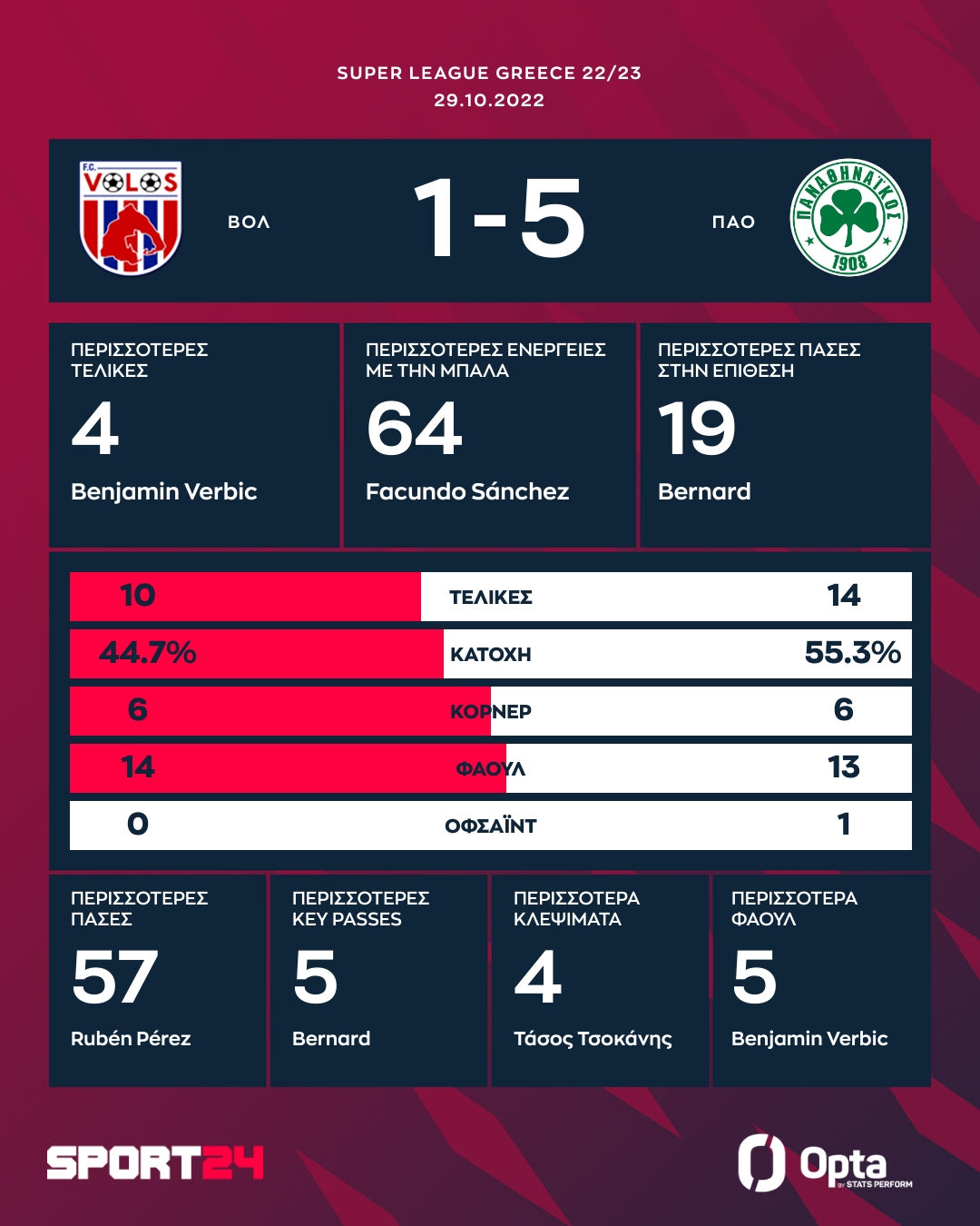 Ο Παναθηναϊκός μετέτρεψε σε πάρτι την αναμέτρηση στο πράσινο Πανθεσσαλικό Στάδιο για την 10η αγωνιστική της Super League, επικράτησε 5-1 του Βόλου και έφτασε τους 30 βαθμούς κάνοντας το 10 στα 10. Δύο γκολ πέτυχε ο Παλάσιος (39', 44') που άνοιξε τον δρόμο.