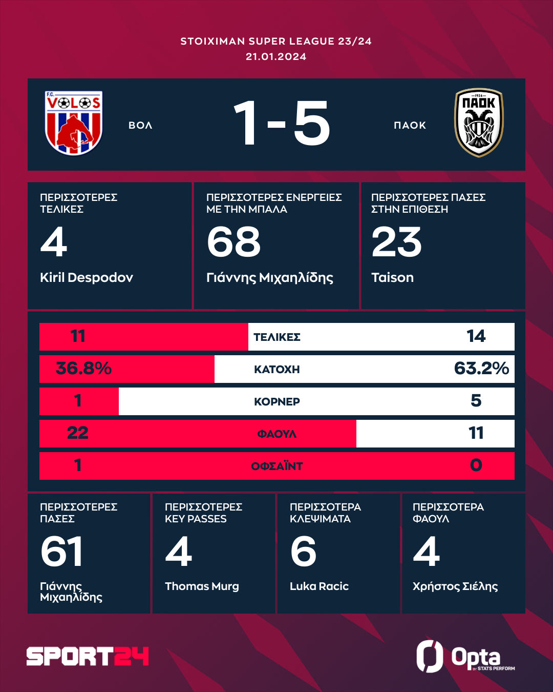 Ο ΠΑΟΚ με άλλη μια ποδοσφαιρική παράσταση επικράτησε του Βόλου με 5-1 με πρωταγωνιστή τον Ντεσπόντοφ, εδραιώθηκε στην κορυφή της βαθμολογίας και περιμένει τον Παναθηναϊκό στο ντέρμπι της Τούμπας την επόμενη εβδομάδα.