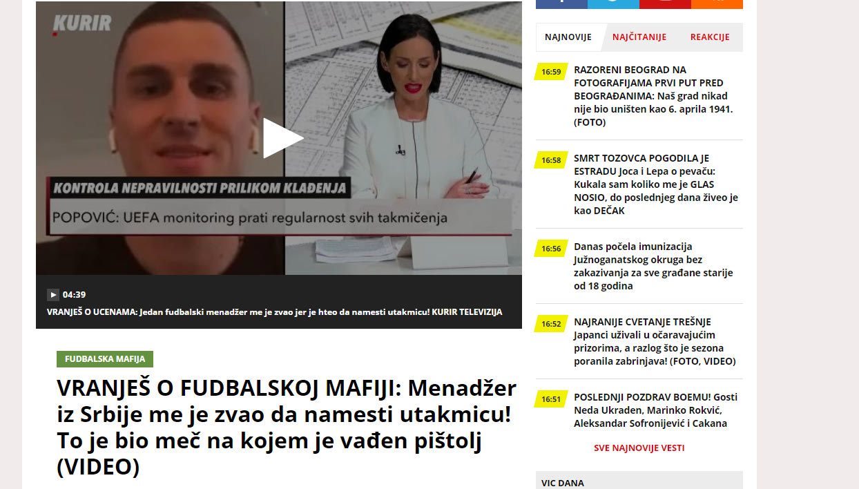 Ο Όγκνιεν Βράνιες δήλωσε ότι Σέρβος ατζέντης του τηλεφώνησε πριν από το ντέρμπι του ΠΑΟΚ με την ΑΕΚ που έκρινε τον τίτλο του 2018 για να στήσει τον αγώνα, αλλά ο Βόσνιος στόπερ αρνήθηκε και ενημέρωσε άμεσα την Ένωση.