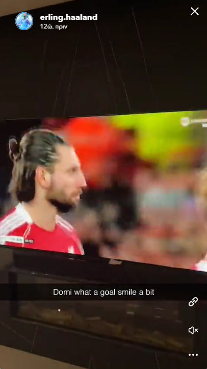 “Ντόμι, υπέροχο γκολ, χαμογέλα λίγο”, έγραψε ο Νορβηγός επιθετικός στην ανάρτησή του, όπου φαίνεται να παρακολουθεί το γκολ του Σομποσλάι.