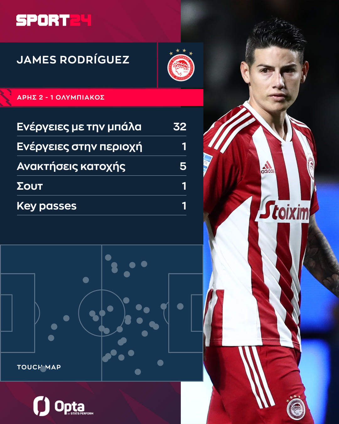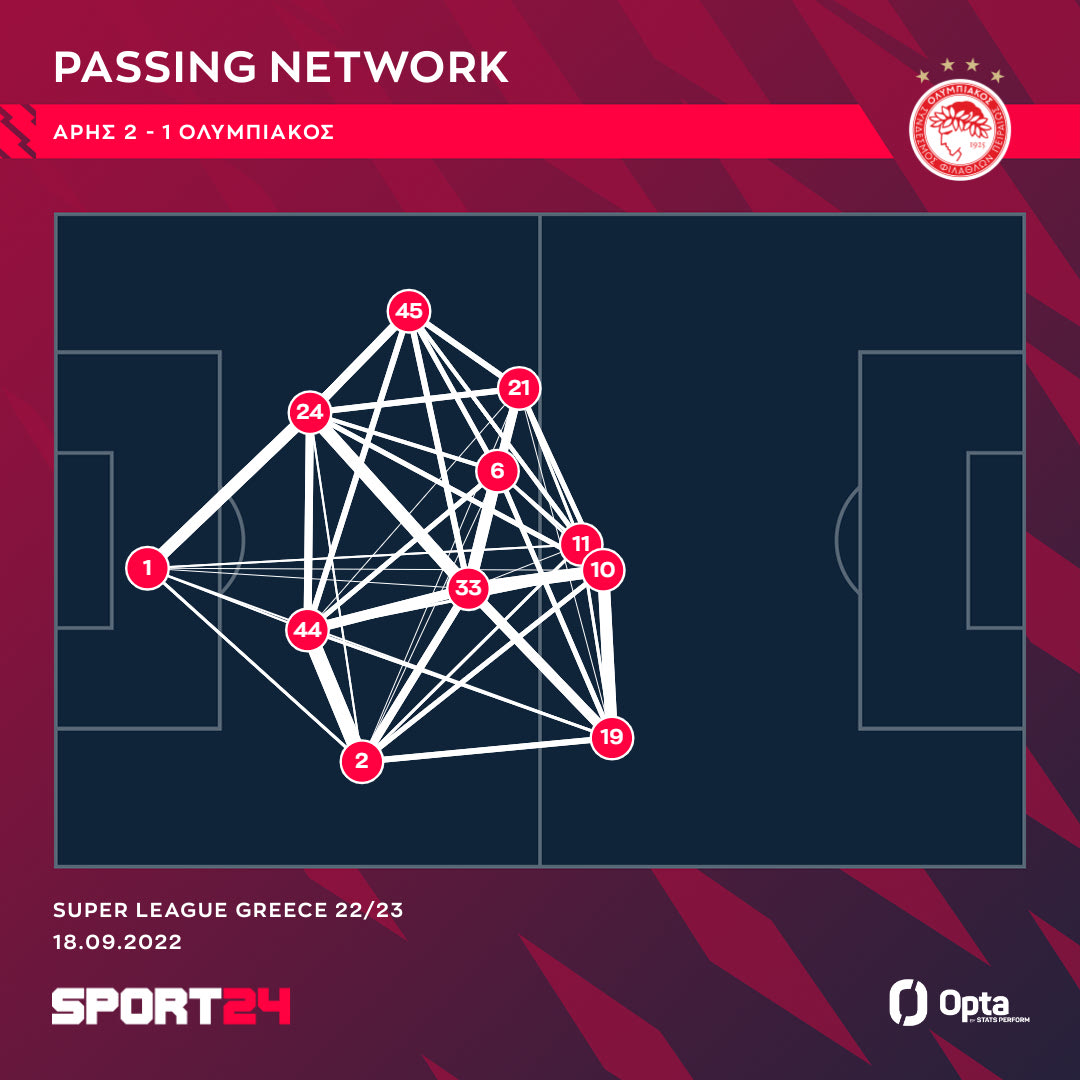 Ο Χάμες Ροντρίγκες είχε 32 ενέργειες με την μπάλα, τις περισσότερες στον άξονα του γηπέδου και στην δεξιά πλευρά. Είχε επίσης μία ενέργεια την περιοχή του Άρη, η οποία ήταν και το σουτ του στην κίνηση, με την μπάλα να φεύγει άουτ. Παράλληλα, συνεισέφερε και ανασταλτικά με πέντε ανακτήσεις κατοχής.