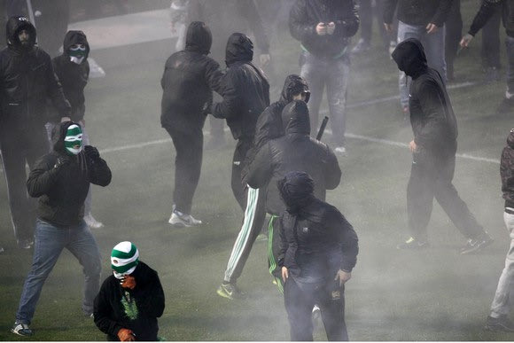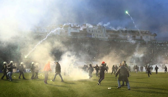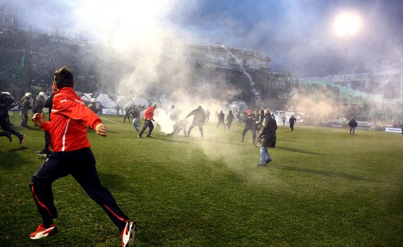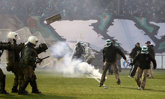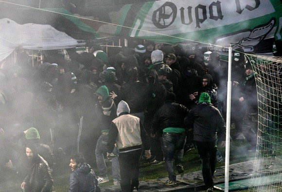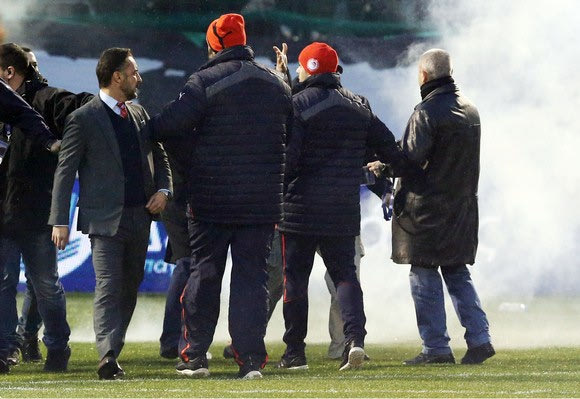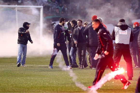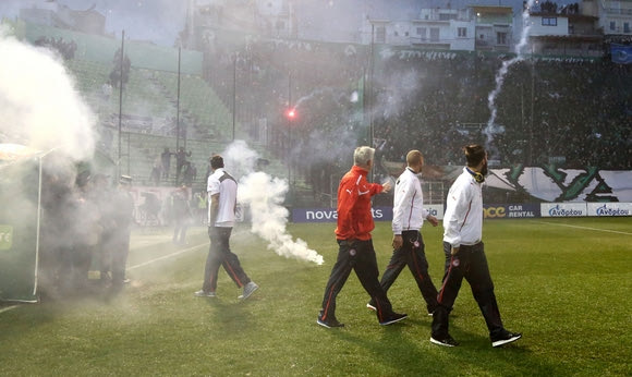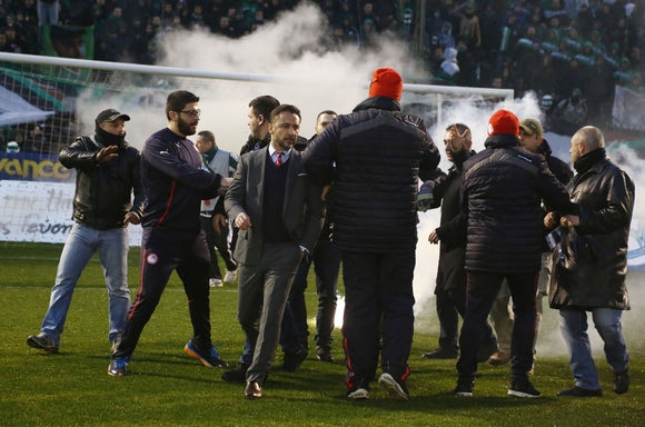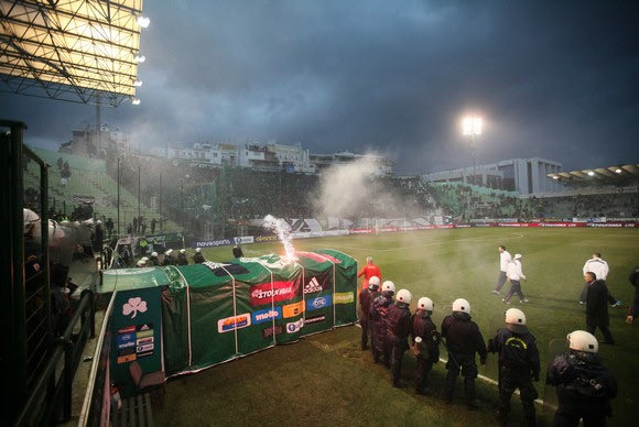 Στην αναγνωριστική βόλτα από τους τερματοφύλακες του Ολυμπιακού έπεσαν φωτοβολίδες. Λίγο αργότερα μπήκαν στο γήπεδο οπαδοί του Παναθηναϊκού και η κατάσταση ήταν ανεξέλεγκτη. Έπεσε ξύλο με τα ΜΑΤ και οι παίκτες του Ολυμπιακού έτρεξαν για τα αποδυτήρια.