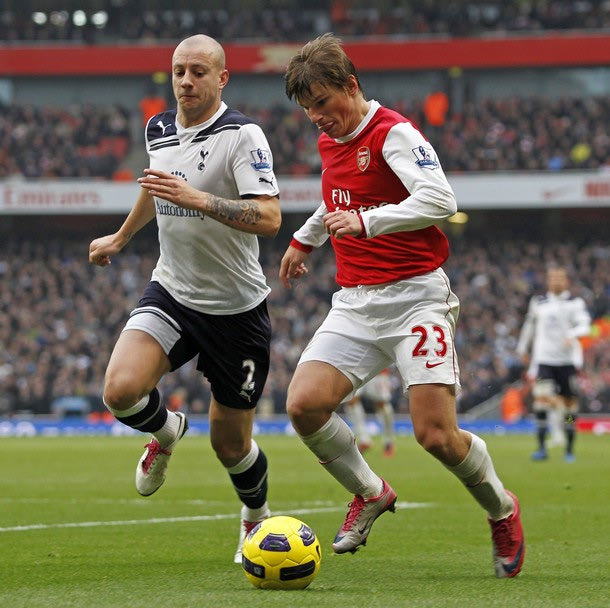 Tottenham Hotspur's Scottish defender Alan Hutton (L) vies with Arsenal's Russian striker Andrey Arshavin (R) during the English Premier League football match between Arsenal and Tottenham Hotspur at the Emirates stadium in north London on November 20, 2010. AFP PHOTO/IAN KINGTON FOR EDITORIAL USE ONLY Additional license required for any commercial/promotional use or use on TV or internet (except identical online version of newspaper) of Premier League/Football photos. Tel DataCo +44 207 2981656. Do not alter/modify photo. (Photo credit should read IAN KINGTON/AFP/Getty Images)