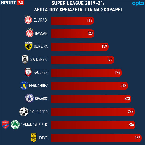 Πάμε να δούμε τα στοιχεία που υποστηρίζουν όσα συζητάμε. Συγκεντρώσαμε τις επιδόσεις των επιθετικών της Super League όπως τις έχει καταγράψει η Opta από το καλοκαίρι του 2019 μέχρι και σήμερα.