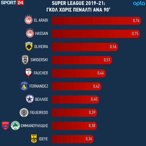 Πρώτος φυσικά ο Αραμπί, με 0.75 γκολ ανά 90′, δηλαδή σκοράρισμα που του δίνει τρία γκολ κάθε τέσσερα ματς. Και, νάτος ο Χασάν, που μπορεί να μην έχει πολλά γκολ στο σύνολο, αλλά ως δεύτερος έχει την ίδια συχνότητα στο σκοράρισμα.