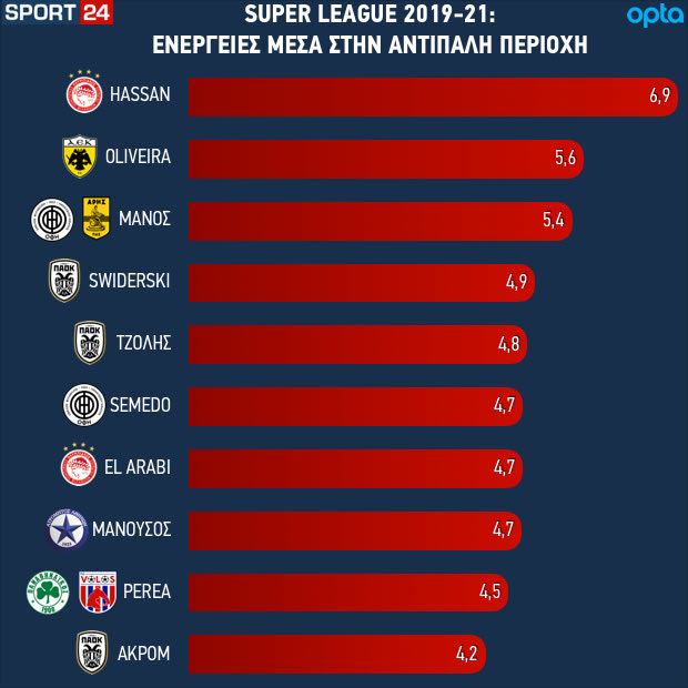 Βασιλιάς ο Χασάν, τους αφήνει όλους πίσω του με 6.9 ενέργειες με την μπάλα στην αντίπαλη περιοχή ανά 90′. Κι όμως είπαμε στην αρχή, εννοείται πως οι μέσοι όροι του είναι “φουσκωμένοι” από όσα πετυχαίνει μπαίνοντας ως αλλαγή.