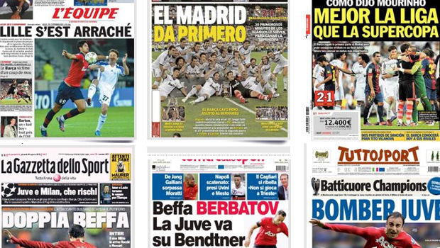 Η μεταγραφή του Μπέντνερ στην Γιουβέντους και η ανακήρυξη του Ινιέστα ως του καλύτερου παίκτης της Ευρώπης από την ΟΥΕΦΑ, μονοπωλούν το ενδιαφέρον τον Ιταλικών και των Ισπανικών εφημερίδων.